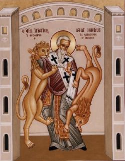 Introit: Galatians vi: 14 M ihi autem absit gloriári, nisi in Cruce Dómini nostri Jesu Christi per quem mihi mundus crucifíxus est, et ego mundo. (Ps. cxli: 2) Voce mea ad Dóminum clamávi: voce mea ad Dóminum deprecátus sum. Glória Patri. Mihi autem.Collect: I nfirmitátem nostram réspice, omnípotens Deus: et, quia pondus própriæ actiónis gravat, beáti Ignátii Mártyris tui atque Pontíficis intercéssio gloriósa nos prótegat. Per Dóminum.Rom. viii: 35-39 Léctio Epístolæ beáti Pauli Apóstoli ad Romános. Graduale: Eccli. 44: 16 E cce sacérdos magnus, qui in diébus suis plácuit Deo. v. Non est invéntus símilis illi, qui conserváret legem Excélsi.A llelúja, allelúja. [Gal. ii:19-20] Christo confíxus sum Cruci: vivo ego, jam non ego, vivit vero in me Christus. AllelújaPost Septuagesimam omissis Allelúja, et Versu sequenti, dicitur Tractus Ps xx: 2-4D esidérium ánimæ ejus tribuísti ei: et voluntáte labiórum ejus non fraudásti eum. v. Quóniam prævenísti eum in benedictiónibus dulcédinis. v. Posuísti in cápite ejus corónam de lápide pretióso.In Missis votivis tempore Paschali omittitur Graduale A llelúja, allelúja. [Gal. ii:19-20] Christo confíxus sum Cruci: vivo ego, jam non ego, vivit vero in me Christus. Allelúja v. [Ps. xx: 4] Posuísti in cápite ejus corónam de lápide pretióso.Joann. xii: 24-26 Sequéntia sancti Evangélii secúndum Matthǽum. I n illo témpore: Dixit Jesus discípulis suis: «Amen, amen dico vobis, nisi granum fruménti cadens in terram mórtuum fuérit, ipsum solum manet: si autem mórtuum fúerit, multum fructum affert. Qui amat ánímam suam, perdet eam: et qui odit ánimam suam in hoc mundo, in vltam ætérnam custódit eam. Si quis mihi minístrat, me sequátur: et ubi sum ego, illic et miníster meus erit. Si quis mihi ministráverit, honorificábit eum Pater meus.»Offertorium: Ps. viii: 6-7 G lória et honóre coronásti eum: et constituísti eum super ópera mánuum tuarum, Dómine.Secreta H óstias tibi, Dómine, beáti Ignátii Mártyris tui atque Pontíficis dicátas méritis, benígnus assúme: et ad perpétuum nobis tríbue proveníre subsídium, Per Dóminum,Communio: F ruméntum Christi sum: déntibus bestiárum molar, ut panis mundus invéniar.Postcommunio: R efecti participatione muneris sacri, quaesumus, Domine Deus noster : ut, cujus exsequimur cultum, intercedente beato Ignatio Martyre tuo at que Pontifice, sentiamus effectum. Per Dominum. |